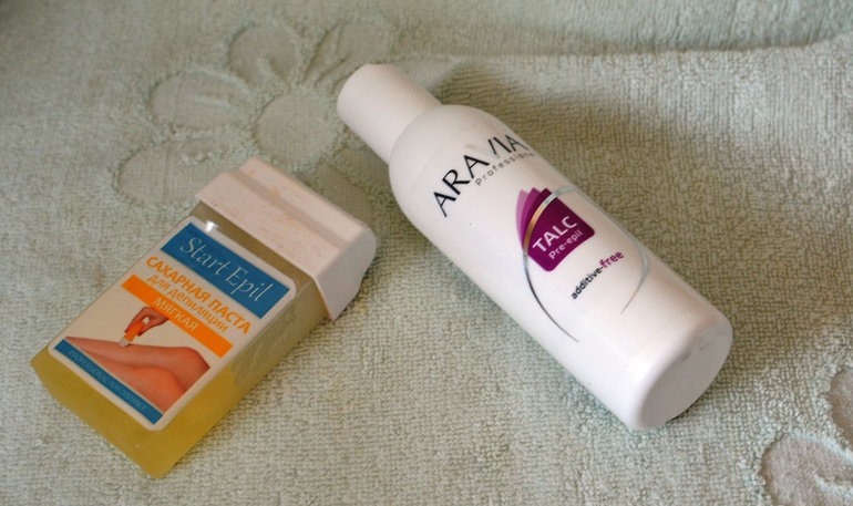 Минимальный набор для шугаринга - тальк, паста и бандажные полоски для депиляции.