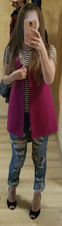 мне тоже очень понравился жилет и самый удачный образ на мой взгляд — с полосатой туникой (майкой) и джинсами. Кстати, если неденете его со строгими брючками или юбкой карандаш — действительно попадете на униформу. Его как раз нужно разбавлять чем-то хулиганским.. )