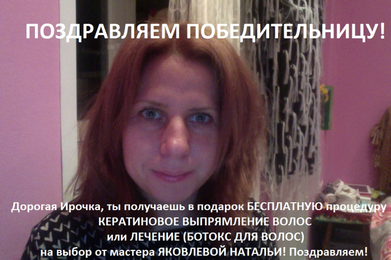 Награждаем всем сообществом "Всё о Красоте" замечательную Ирина и отправляем её на КЕРАТИНОВОЕ ВЫПРЯМЛЕНИЕ ВОЛОС или ЛЕЧЕНИЕ (Ботокс для Волос) в золотые ручки Наталья (Закупка Шеллака) и с нетерпением ждем рассказа о впечатлениях!
