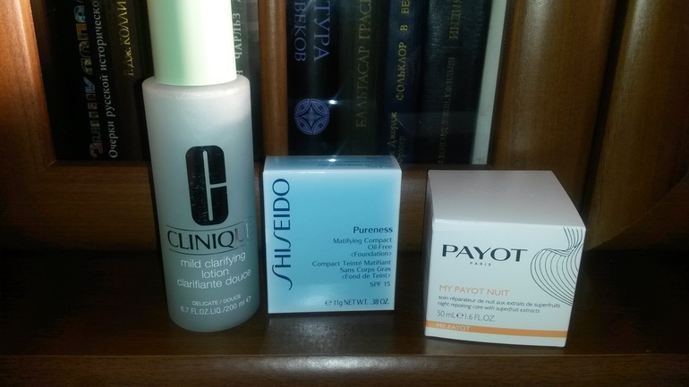 Итак, Лосьон Клиник 549 руб,ночной крем Пайот 1249 руб, пудра Шисейдо матирующая 1024 руб (на такую цену первый раз расщедрилась..посмотрим, стоит ли она таких денег )