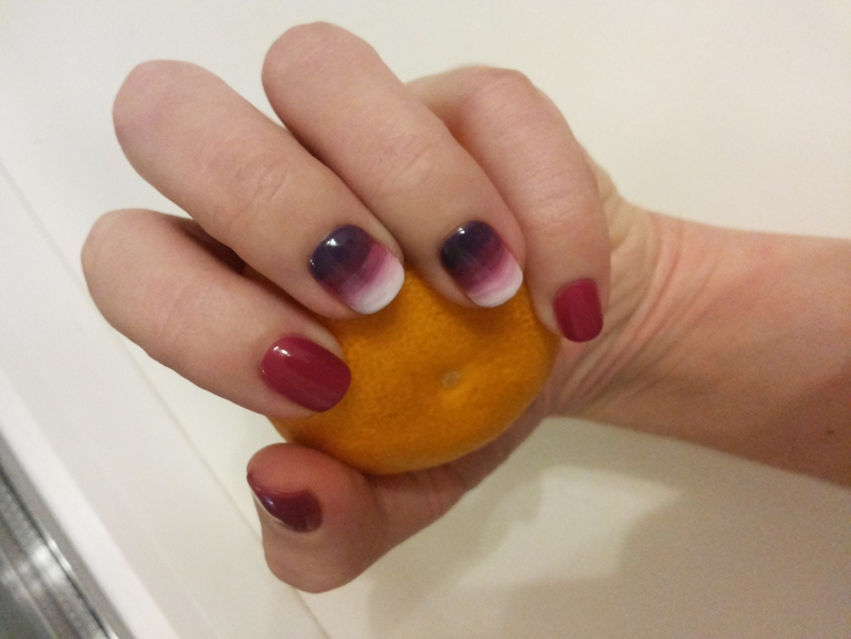 Имхо, градиент получился со слишком четкими переходами, поэтому эфыект полосатого ногтя. Я бы заменила белый на розовый. И сделала переход плавнее. П.с. на первом фото белый край ногтя очень выделяет некую ассиметрию (то ли дефект маникюра, то ли изгиб пальца такой).
