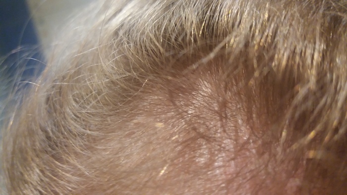 Кожица покрасневшая и раздраженная. Волосы тооонкие, как паутинка.