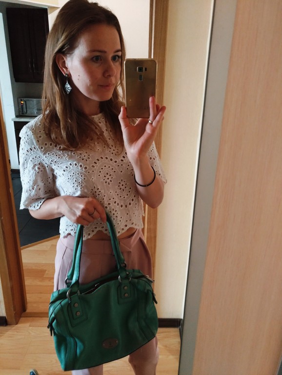 Зеленая сумка морально устарела, со второй лучше. Не понимаю участок голого живота в данном контексте - либо брюки выше должны быть, либо блуза длиннее.