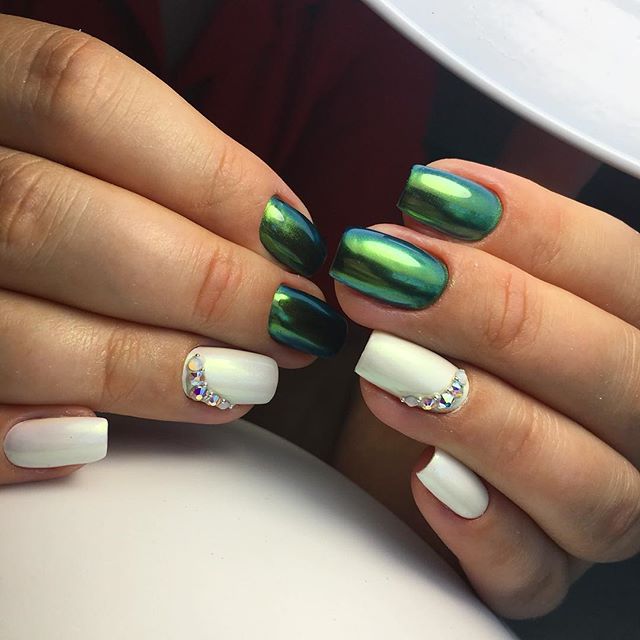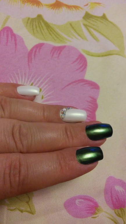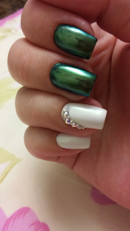 Красивый зелёный, но мне хочется как-то подружить ногти между собой, например стразы чтоб были такие же зелёные.