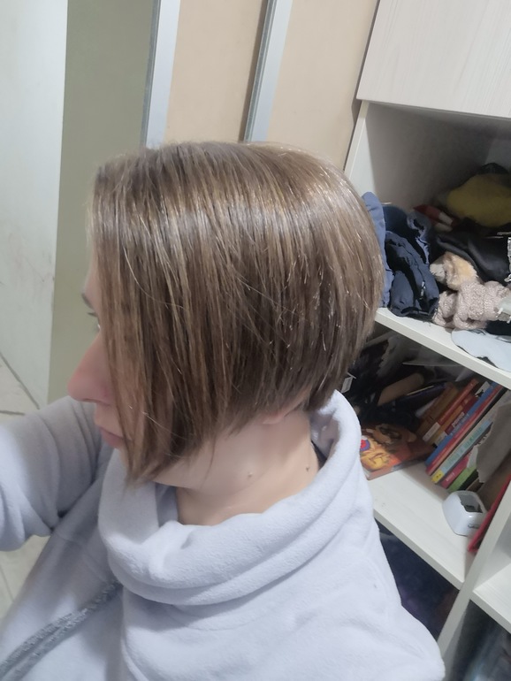 Далее мне делали тон серый не крем-краской, а прямым пигментом. Это например антоцианин (мне не его делали, другое, но смысл тот же) прямой пигмент уже идёт без обесцвечивания, но он нейтрализует желтизну. Серый, но можно и розовый, зелёный и синий и тд. Это уже не принципиально, жёлтого уже не будет