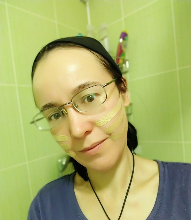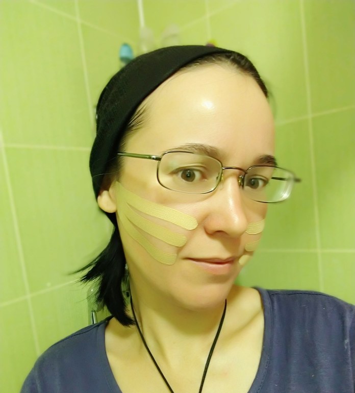Пока я боюсь делать такие варианты, когда тейп проходит от лба вдоль носа к уголкам губ, - если неправильно наклеить и сделать складку на коже, то новая морщина обеспечена. По сему выбираю легкие пути))).