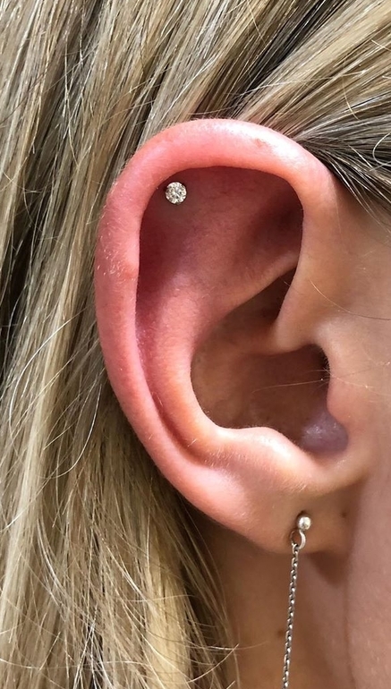 Прокалывали не под гвоздик, а толстой иглой для пирсинга, серьга была также для пирсинга- кольцо с двумя шариками на окончаниях.