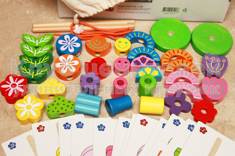 32 разноцветные деревянные фигуры, 12 двусторонних карточек с 24 заданиями, 2 подставки, шнурок, знаменитый GoGoшный мешочек для хранения ))