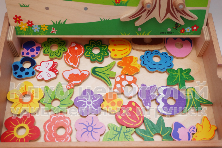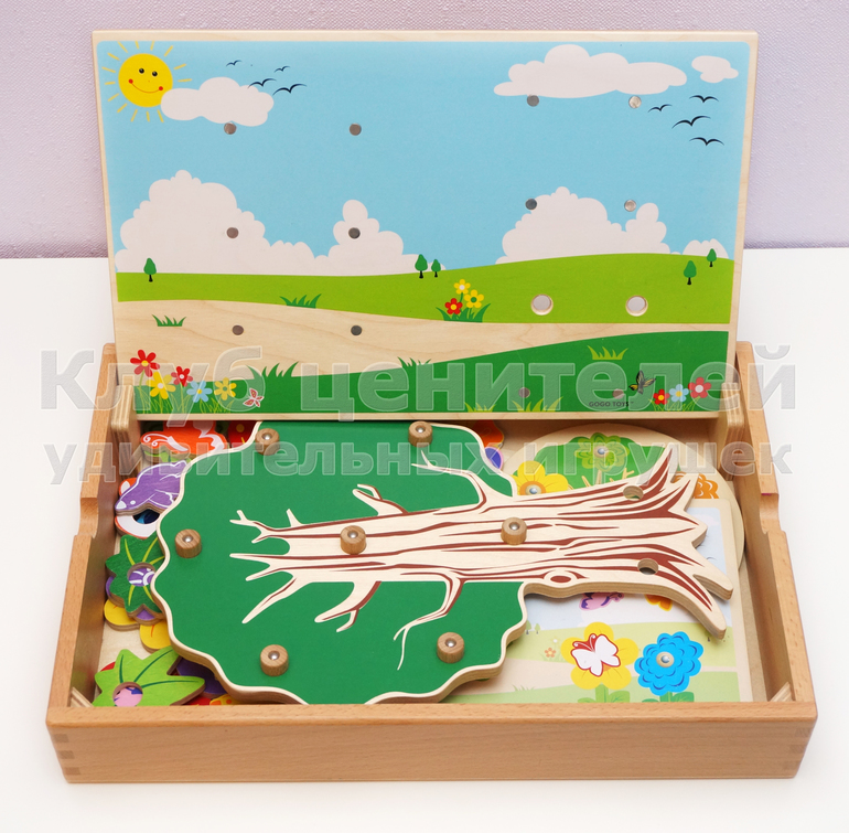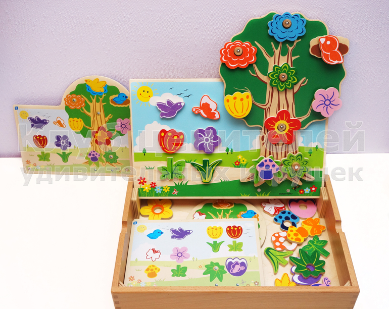 В ящичке спрятались: 31 деталь для украшения, 1 дерево, 2 винтика, 8 карточек.