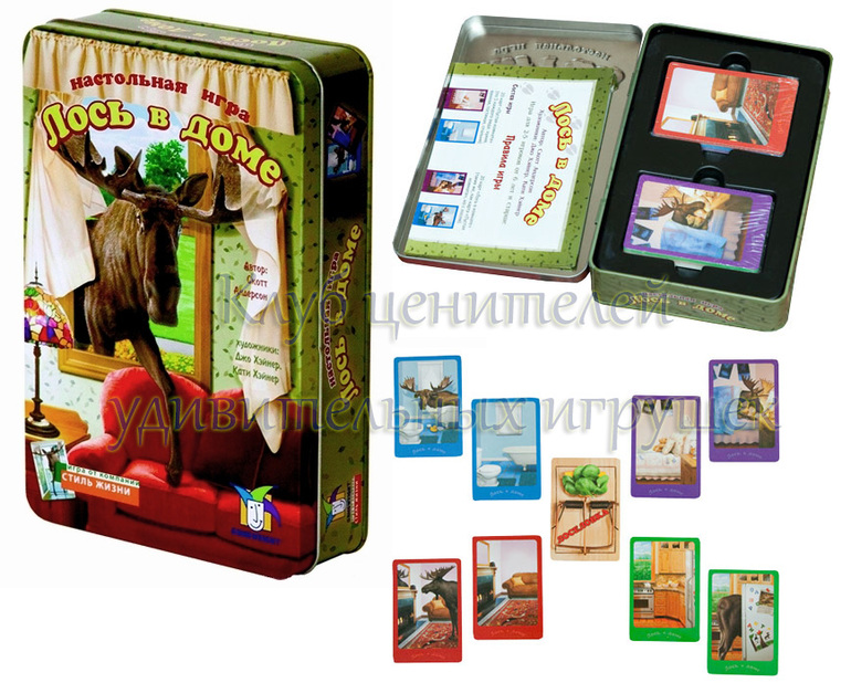 Состав игры: 20 карт «Пустая комната» (по 5 каждого вида: кухня, ванная, гостиная, спальня), 20 карт «Лось в комнате» (таких же, как карта «Пустая комната», но с лосем), 10 карт «Лось в доме!», 5 карт «Дверь», 3 карты «Лоселовка», правила игры на русском языке, жестяная коробка.