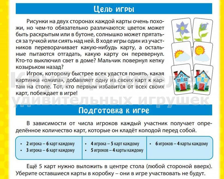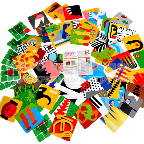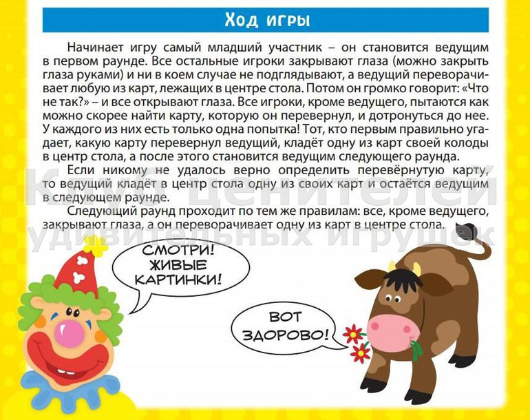 Состав игры: 24 карты с картинками, 20 колпачков (4 набора колпачков 5 разных цветов), 1 звонок и правила на русском языке.