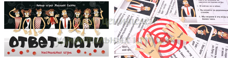 Состав настольной игры Ответ-пати (Declic): 89 карт (по 4 утверждения на каждой, всего 356 утверждений), 1 карта Ответа и правила игры на русском языке. Продолжительность игры 15 мин.
