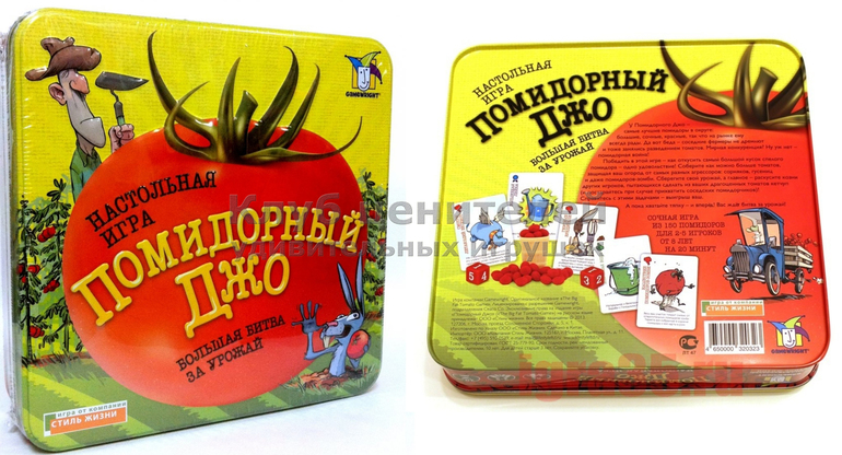 Состав игры: 150 маленьких мохнатых помидоров, 60 карт, 5 корзин, 2 кубика; правила игры на русском языке, жестяная коробка.