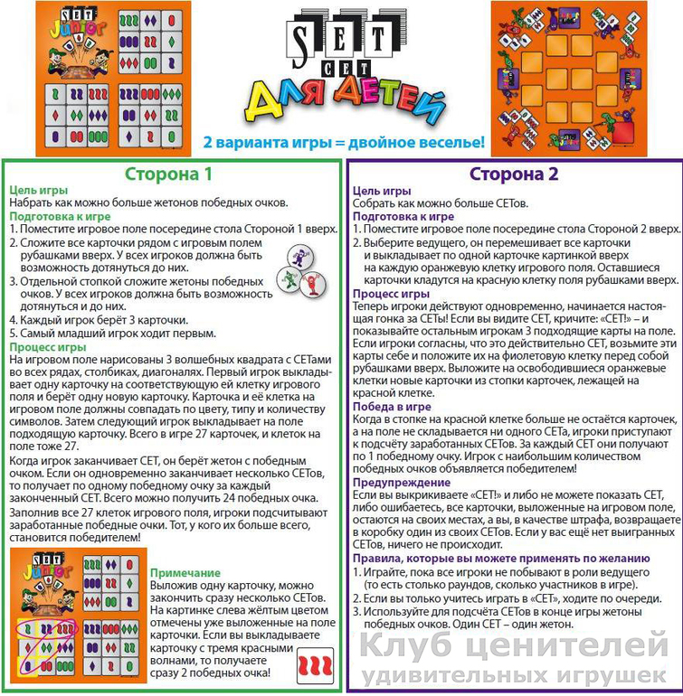 Благодаря особенному двустороннему игровому полю в Сет теперь можно играть, начиная с 3 лет! Выкладывайте карточки на соответствующие клетки поля и получайте по победному очку за каждый законченный набор карт (СЕТ).