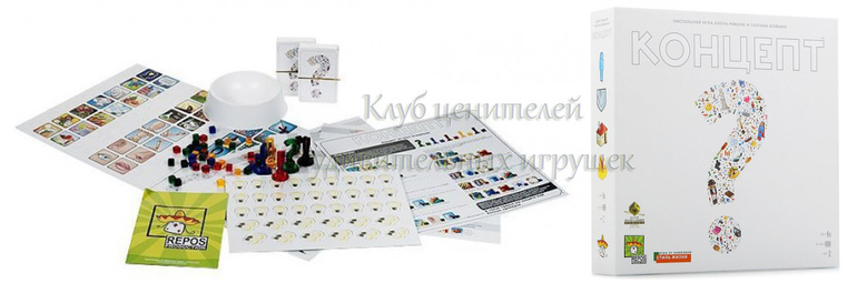 Компоненты игры: 1 игровое поле с универсальными иконками, 5 наборов маркеров: 1 зелёный набор, состоящий из фишки главного концепта (большой знак вопроса) и 10 кубиков; 4 набора (синий, тёмно-серый, красный, жёлтый), состоящих из фишки дополнительного концепта (восклицательный знак) и 8 кубиков. 110 карт концептов, на каждой из которых по 9 слов (или фраз) трёх уровней сложности (простой, сложный и невероятный). Жетоны двойных и одиночных победных очков (ценность двойного жетона 2 победных очка, ценность одиночного - 1 победное очко), 2 памятки игрока, 1 чаша для хранения компонентов