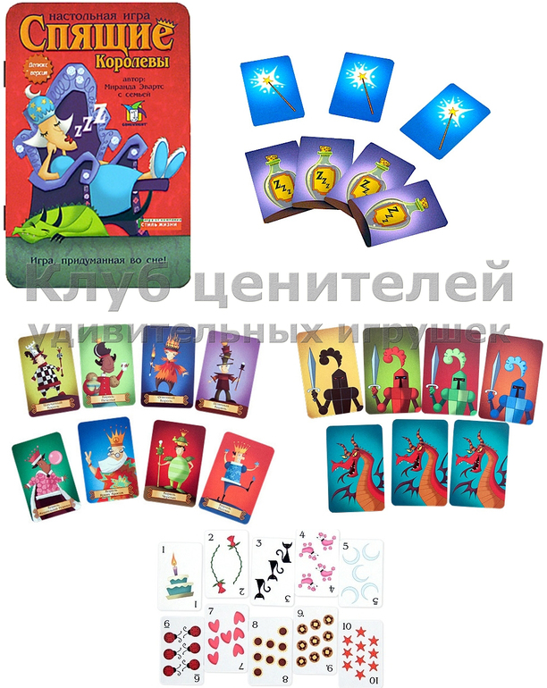 Состав игры: 79 карт: 12 Королев, 8 Королей, 5 Шутов, 4 Рыцаря, 4 Сонных зелья, 3 Волшебные палочки, 3 Дракона, по 4 экземпляра карт с цифрами от 1 до 10; правила игры на русском языке, жестяная коробка. Размер коробки: 20 х 13 х 6 см.