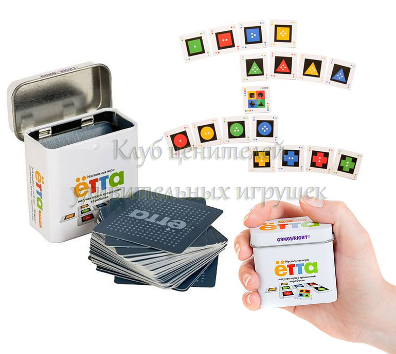 Ётта - могучая игра в крошечной коробочке! Это простая логическая игра для всех: правила её предельно понятны, а процесс очень увлекателен. Игра содержит 64 карты, у каждой из которых есть по 3 признака: цвет, форма и число внутри. Игрокам раздаётся по 4 карты, одна карта кладется в центр стола. Далее игроки по очереди могут выложить 1, 2, 3 или 4 карты, чтобы получилась Линия, а лучше Цепочка. Игрокам нужно держать в голове одновременно три признака карт, а также видеть всю картину в целом, чтобы не пропустить место для своей карты.