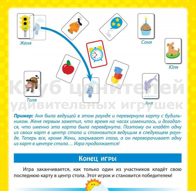 На картах вертикально или горизонтально изображены цветные предметы: цветы, поезда, кубики… Один из игроков переворачивает верхнюю карту, и все стараются как можно быстрее расставить свои колпачки по цветам в последовательности, нарисованной на карте. Расставивший колпачки игрок ударяет по звонку. Тот, кто позвонил первым, получает открытую карту.