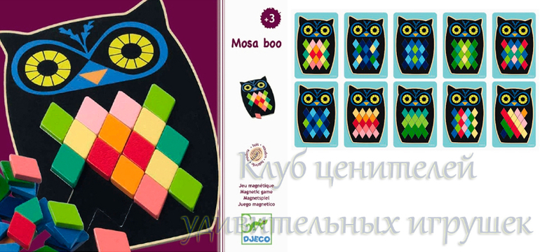 В наборе: основа-сова, 10 карточек с заданиями, 57 маленьких разноцветных ромбов.