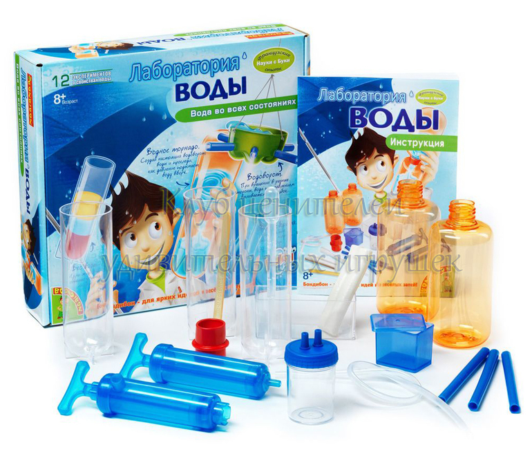 Добро пожаловать в Лабораторию Воды! Вода - это одна из самых важных стихий на Земле. Вода - настоящая путешественница, она содержится в воздухе и в земле, ее можно встретить, конечно, и в наших домах. Она не имеет ни вкуса, ни цвета, но ее свойства поистине удивительны! Вода используется людьми не только для утоления жажды, ее можно применять для самых разных и удивительных целей. Игровой набор "Лаборатория воды" предлагает провести 12 занимательных экспериментов, которые помогут в изучении физических и химических свойств воды а также материалов, впитывающих воду.