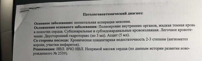 Относительно причин гибели вашей малышки- патолог считает, что причина смерти- аспирация мекония (первичного кала), она происходит как осложнение гипоксии ребёнка в родах (видимо, гипоксия возникла во время схваток, это подтверждает ваш рассказ о том, что перед кесаревым отошли зеленые воды)