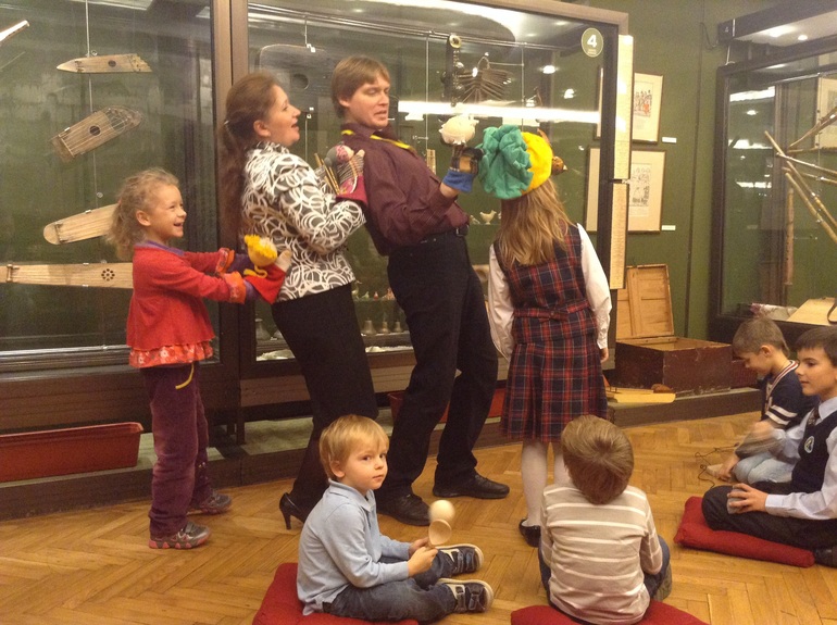 2. Экскурсия. Отличная тема, нам по возрасту вполне подходящая. Вовлеченность детей, где они не только слушатели, но и музыканты, которые при помощи маракасов, бубнов или экзотичных индийских "палочек дождя" озвучивали "Репку", и актеры, которые были внучками-Жучками-Мурками-мышками (ролей хватило на всех), и танцорами, исполнявшими под классическую музыку минуэты. Было весело.