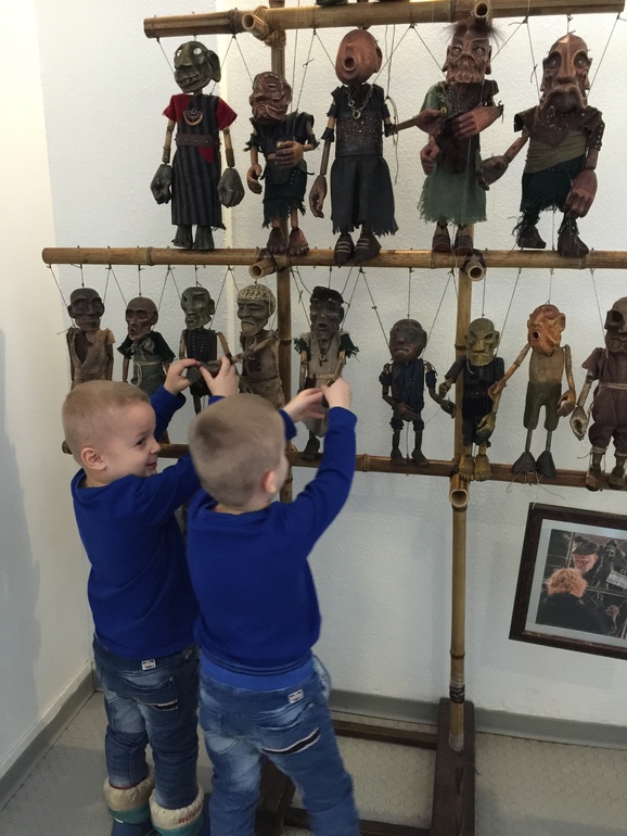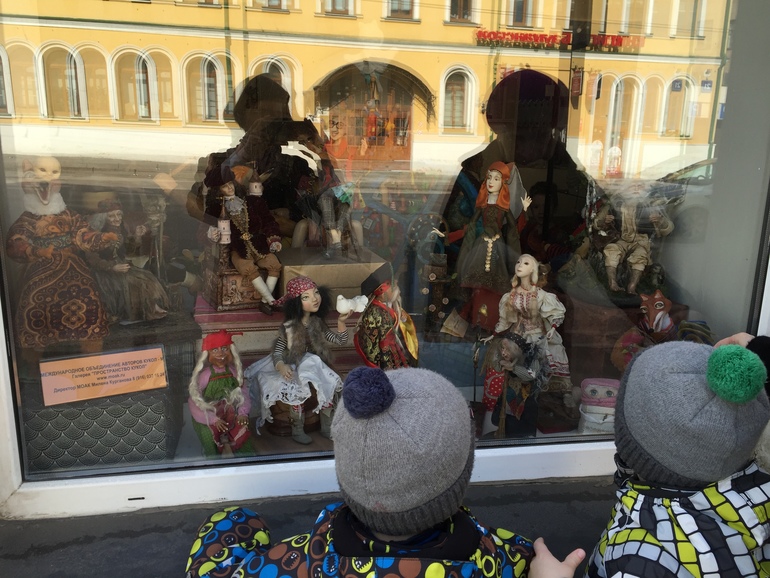 Первое, на что обратили внимание - очень удобно добираться))) театр находится буквально в 200 метрах от метро "Бауманская". В окнах и в фойе размещена выставка кукол, некоторых из них можно трогать, что детям, конечно, было интересно.