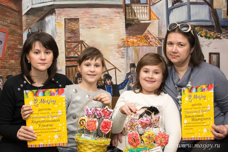На фотографии любящие мамы Виктория и Ольга, которые подарили своим детям вкусные впечатления. Красавицы Маргарита и Ульяна вместе со своими друзьями посетили мастер-класс "Пряничный букет" в ресторане "Иберия Хаус".