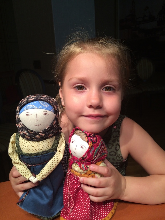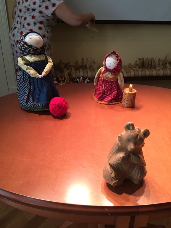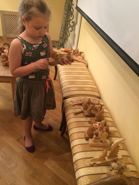 Нас с дочкой пригласили в зал, посадили на стульчики и с помощью деревянных, глиняных, тканевых игрушек рассказывали сказки.
