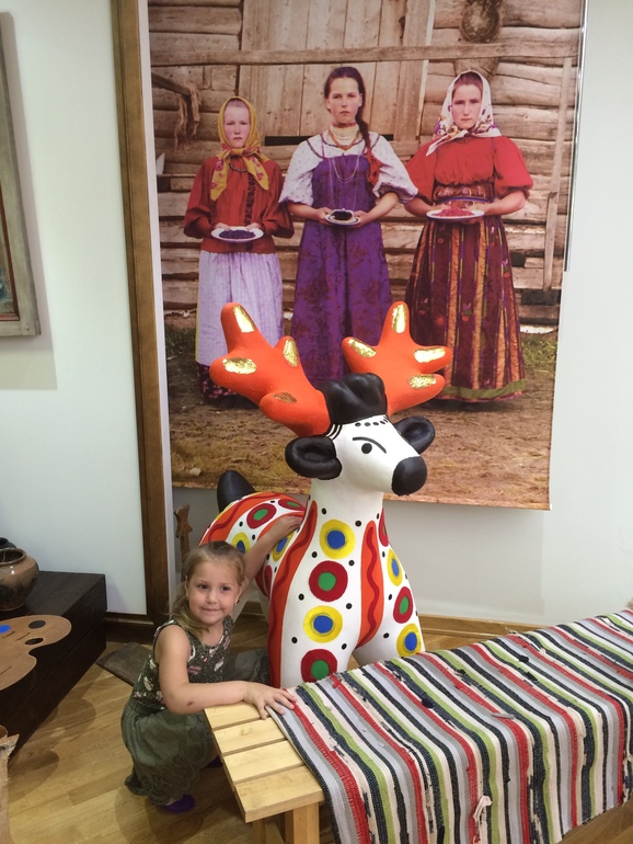 Там стояли прялки, коклюшки с кружевом и много старинных игрушек, которые можно было посмотреть и потрогать. А еще огромный дымковский олень! ОГРОМНЫЙ!!!