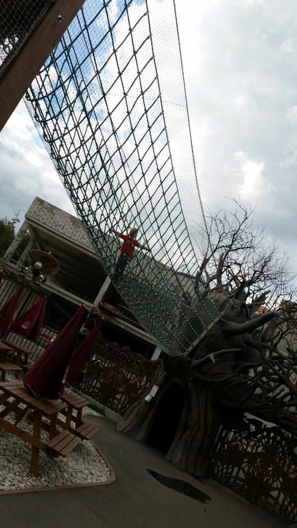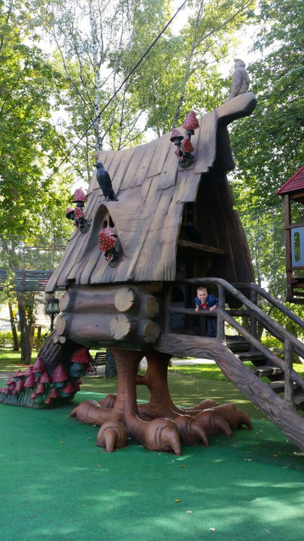 Есть там такая тропа по всему парку где можно лазить по ней как в панда парке только все на много круче!!! И заметьте бесплатно пока что. Там есть ещё кафе мы там не кушали но зашли посмотрели , очень уютно. Выполнено кафе в виде старорусской избы.