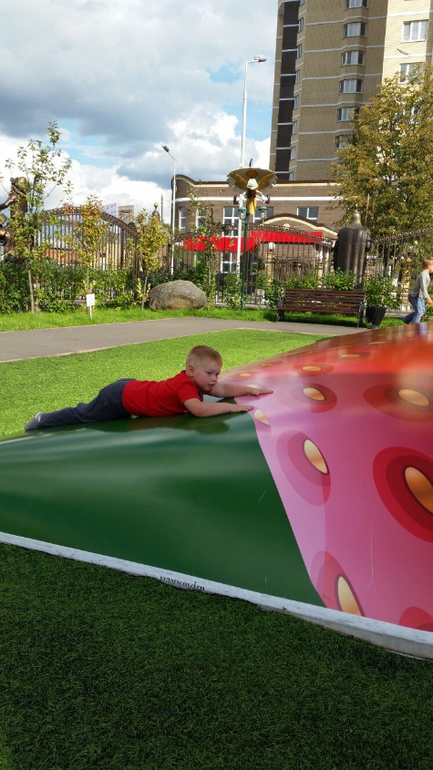 В конце парка есть огромный батут где все детишки прыгают и радуются своему беззаботному детству.