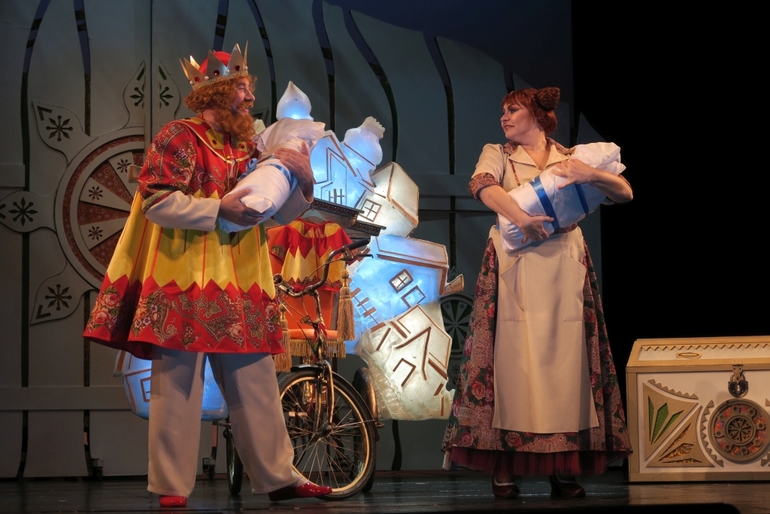 Хочется отметить что каждому герою был создан интересный образ. Иваны пленники мельника одеты просто как и царь. Иван "царский"сын нстоящий щёголь напоминающий Элвиса Пресли. Баба Яга настоящая рокерша с метлой -гитарой. Костюмы и декорации интересно рассматривать. Мне очень понравились коляски-тележки,причём царская была отмечена короной. Кощей в модных штанах с лампасами и жёлтых носках пластично перемещался по сцене. Несмотря на отрицательную роль проникаешься к нему симпатией)