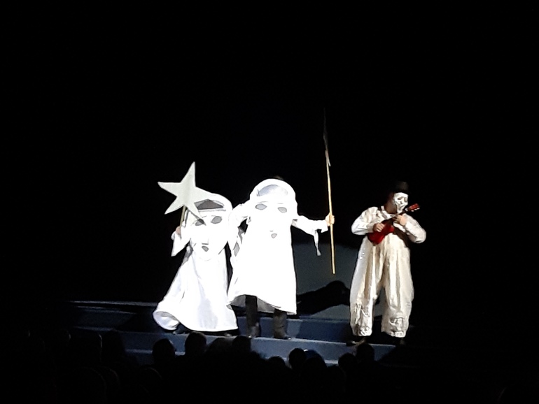 Спектакль долгий, антракт длинный. Все вместе заняло около 3-х часов. Маленьким детям было тяжело, периодически в зале кто-то плакал, ходить во время представления запрещено, за этим строго следят. Это не сказка, сюжетной линии особой нет, лишь главный герой-путешественник связующей нитью проходит между номерами.
