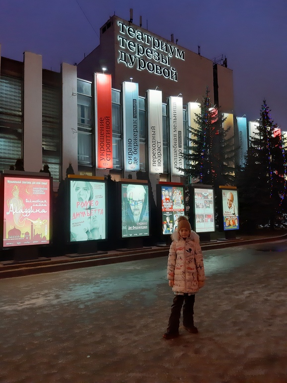 В Театриуме мы были впервые, это наше знакомство с театром. За полчаса до спектакля мы доехать не успели, поэтому шоу-разминку со снеговиками перед началом спектакля мы пропустили. Места у нас были в бельетаже на 5-ом ряду (300р. за билет), ребенку ростом 115 см видно было плохо, поэтому мы пересели выше на 8-ой, оттуда видно было отлично.