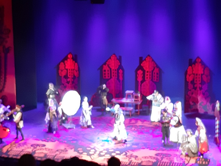 Первый акт состоит из трёх частей: первая цыганско-цирковая (песни пляски, цирковые номера), вторая сцена происходит в деревне и харчевне, она несколько затянутая и нудноватая, мой 5-летка заскучал, а вот затем началось самое интересное - третья часть. В ней появляются колдун-химик, скелеты-мертвецы, персонажи животных, превращенных наполовину в людей. Мои дети оживились, на сцену смотрели уже не отрываясь) Второй акт пролетел весело и на одном дыхании. Концовка несколько смазана, я не очень поняла, как победили злого волшебника, но мои дети этого как-то и не заметили, у них вопросов не возникло.
