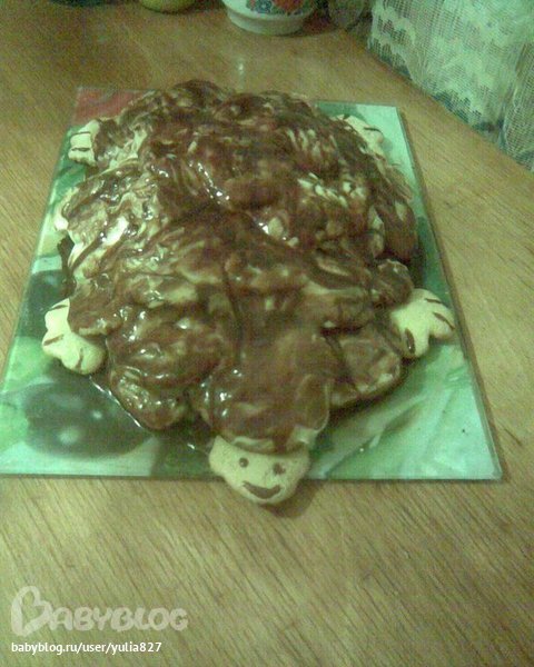 Тесто как на оладьи. Чайной ложкой выкладывать на посыпанный мукой противень,снимать горячими. Сложить в виде черепахи слоями,слоя смазывать кремом. Полить глазурью.