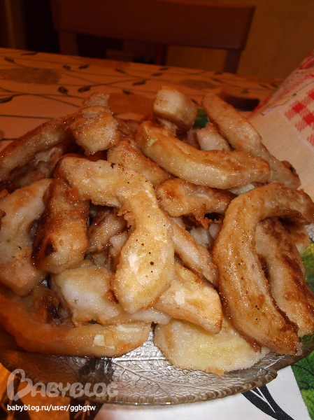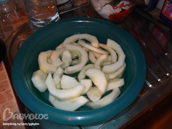 Итак, кабачки чистим, нарезаем на полукольца и складываем в тазик с обычной холодной водой.