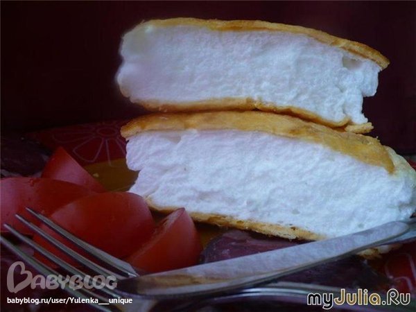 Отделите белки от желтков. Белки поместите в достаточно глубокую посуду. Для желтков это не принципиально. Яйца должны быть холодные. Посолите белки и желтки.Взбейте белки до крепкой пены.Затем перенесите миксер в посуду с желтками и слегка перемешайте и их. Взбивать не обязательно.Поставьте сковороду на средний огонь Если у вас большая сковорода и мало яиц, то для того, чтобы желтки равномерно покрыли все дно в них можно добавить немного молока( или воды). Вылейте желтки на горячую сковородку. В оригинальном омлете предлагается на желток вылить взбитые сливки.Мне не понравилось - сливки тут же тают и стекают под желток.Теперь сверху на желтки выложите взбитые белки. Разровняйте лопаткой. Сделайте минимальный огонь. Крышкой не закрывать! Для того, чтобы проверить, готов ли омлет, достаточно коснуться белковой пены пальцем. Если к нему не липнет белок и палец пружинит, омлет готов! Разрезать омлет на две половины и сложить его белком внутрь.
