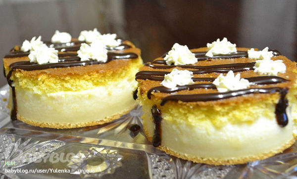 (Все ингредиенты смешиваются, получается очень жидкое тесто, но в духовке оно "умным" образом расслаивается на слои: и у вас получается торт с кремом посередине. Расслоение происходтит за счет разной жирности составляющих.)