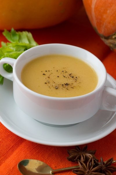 Приближается Хеллоуин. Поэтому вчера я попробовала приготовить диетический пирог с тыквой. Но все провалилось, вкус пирога мне совсем не понравился. Полезла читать отзывы в интернете на счет сладостей из тыквы — и поняла, что все они на любителя, специфические. Прошу у Вас совета, может знаете вкусный и не калорийный десерт из тыквы? Буду очень благодарна за рецептики! А сегодня я решилась приготовить тыквенный суп-пюре, очень боялась разочароваться. Разрезав тыкву, я получила чудесный аромат, напоминающий дыню, что очень меня обрадовало. Сам процесс приготовления супа — проще простого! Аромат от сельдерея и тыквы — был потрясающий, но я ждала финала, чтобы попробовать этот суп. В итоге, получился вкуснейший суп-пюре из тыквы! За обед мы все съели и муж просил добавки! Завтра буду готовить еще. Попробуйте и Вы этот полезный и солнечный супчик. Приятного аппетита!