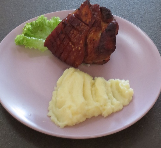 Выключаю (мясо лучше не оставлять в выкл духовке долго -тоже станет сухим),достаю, ставлю сито в чашку,выкладываю туда овощи запеченные , перетираю (достаточно муторно, в слд раз хочу попробовать использовать блендер) заливаю бульоном с противня до нужной констистенции-соус готов. И...блюдо получается с русским акцентом,так как я делаю не немецкие кнодели, а пюре. Подаю на стол (только недавно купила ложку для мороженного,так что пюре буду выкладывать теперь красивее)
