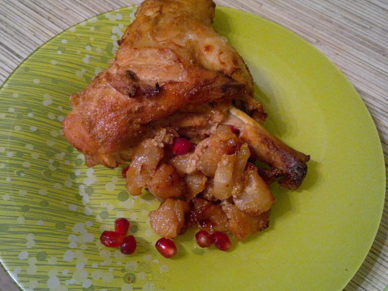 Затем 3 ст. ложки горчицы смешала с 3 ст. ложками меда и этой смесью натерла уже замариновавшееся мясо. К мясу добавила 3 нарезанных яблока без кожуры и все это дело засунула в рукав для запекания.