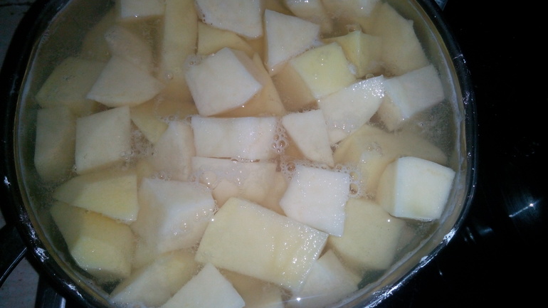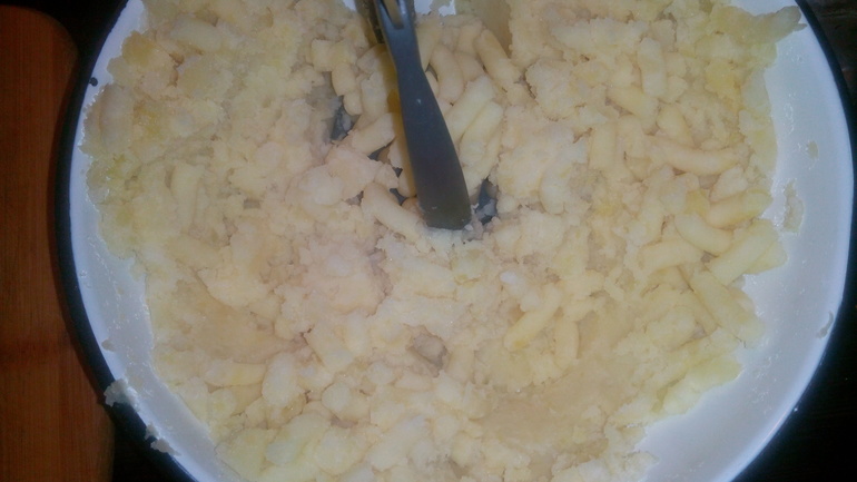С готового картофеля сливаем воду, делаем пюре, добавляем молоко тёплое.