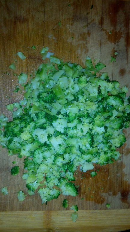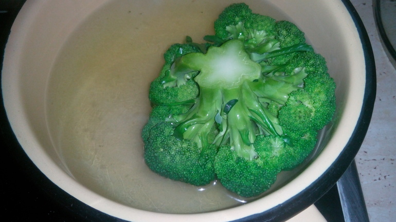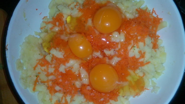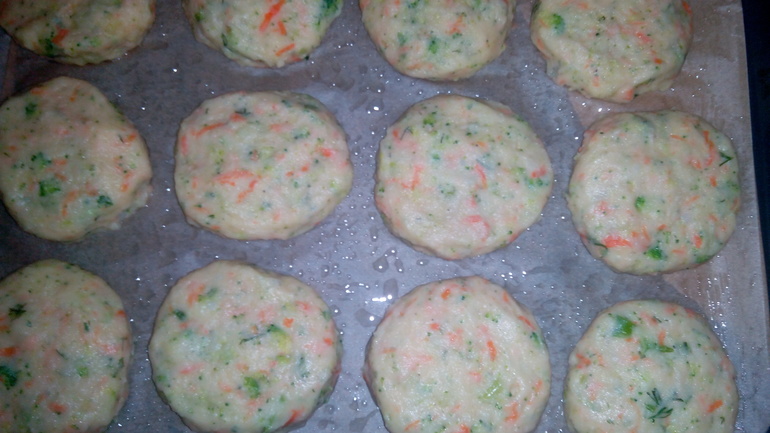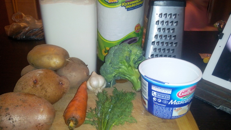 Картофель 5 шт, 1 не большая морковь, не большое соцветие брокколи, укроп, яйца, чеснок для масла, масло растительное домашнее, сода, соль, перец.