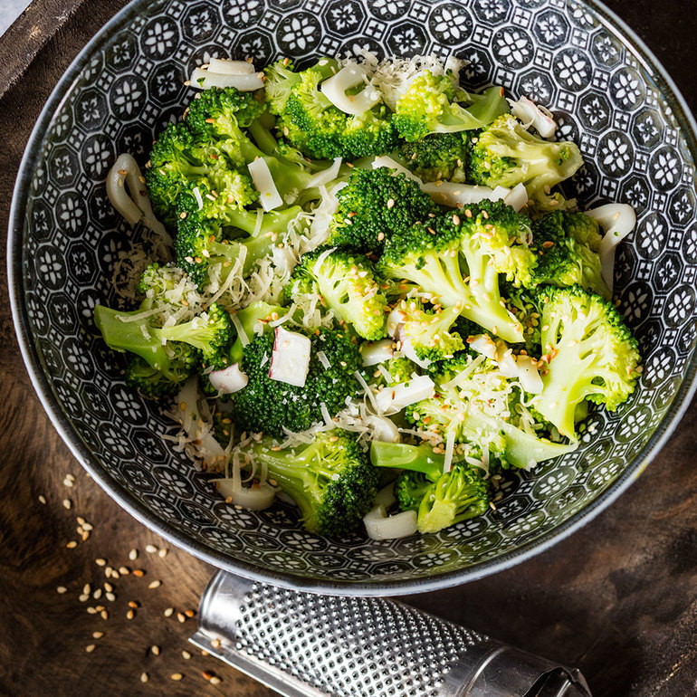 Брокколи 100 г отварите в подсоленной воде в течение 5 минут, отваренную брокколи порежьте пополам. Очищенные кальмары 2 шт положите в кипящую подсоленную воду с приправами на полминуты и сразу вытащите, остудите. Кальмары порежьте полосками, перемешайте с брокколи, заправьте оливковым маслом, посыпьте пармезаном и кунжутом.