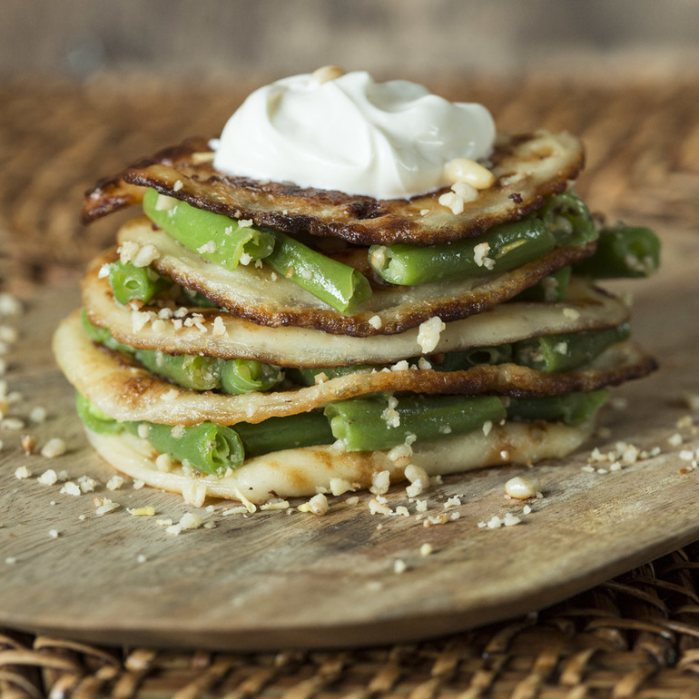 Разбейте 3 яйца и взбивайте их венчиком в течение 1 минуты, соедините с 3 ст.л сахаром, затем добавьте натуральный йогурт 2,5 ст, 2 ст. ложки растительного масла, просеянную муку 2 стакана и тщательно вымесите тесто (густоту теста контролируйте мукой). Соду погасите лимонной кислотой, добавьте в тесто, перемешайте. Нужна консистенция нежирной сметаны. Дайте настояться 15 минут. Сделайте пробный оладушек, пока тесто настаивается. Тесто готово. При необходимости разбавьте тесто теплой водой. Обжарьте оладьи с двух сторон, делая более плоскими, нежели классические оладьи. Предварительно размороженную в холодильнике фасоль обжарьте на сливочном масле вместе с орехами и измельченным чесноком в течение 5-7 минут на среднем огне. Добавьте лимонный сок, соль и тщательно перемешайте. Для подачи оладьи выкладывайте стопкой на тарелку, чередуя с зеленой фасолью.
