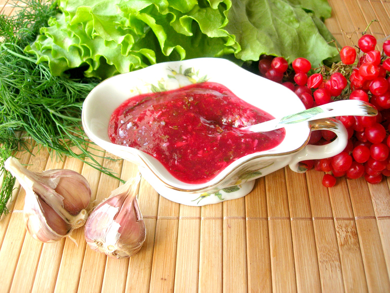 Рекомендации к рецепту: я рекомендую использовать калину подмороженную, чтобы из нее ушла лишняя горечь, поэтому перед приготовлением соуса, калину лучше отправить в морозильную камеру. После того как все ингредиенты соуса смешаны, рекомендую попробовать соус на вкус, перед варкой, возможно, вам захочется слегка изменить пропорции, добавить сахар, соль или другие специи по своему вкусу. Для тех, кто не любит запах калины, хочу отметить, что благодаря специям в этом соусе он совершенно не чувствуется.
