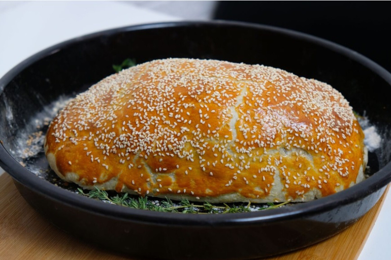 9. Сверху тесто смазываем яичным желтком и посыпаем кунжутом.