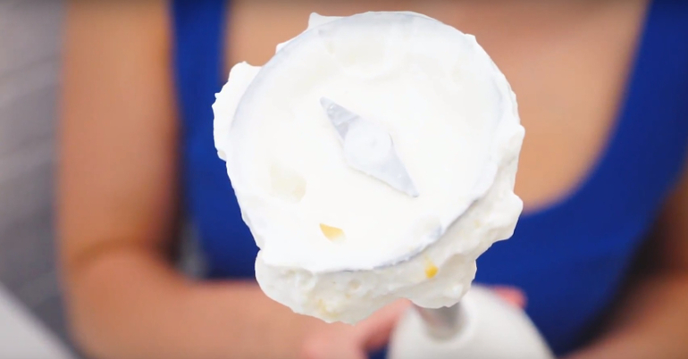 2.Вылить молоко и растительное масло в емкость для взбивания погружным блендером.